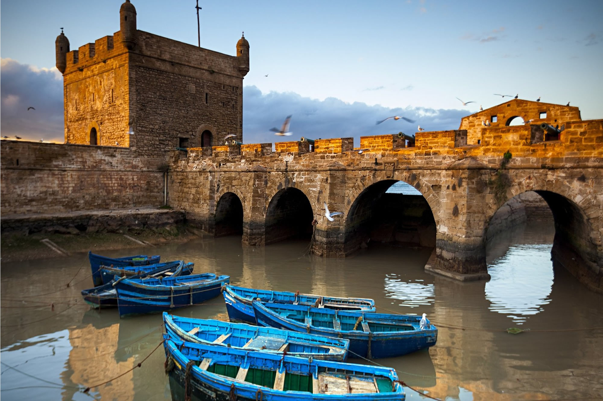 Essaouira is a beautiful coastal town[medina] set on the Atlantic Ocean. Listed as a World Heritage Site, you will soon realise why. There are old ramparts with mounted brass cannons so the city could defend the walls from ancient invaders. There are several restaurants and Essaouira is famous for the fish and seafood cafes serving the daily catch . The large promenade on the beachfront has a sandy beach for bathers and a tour around the fish market is recommended.